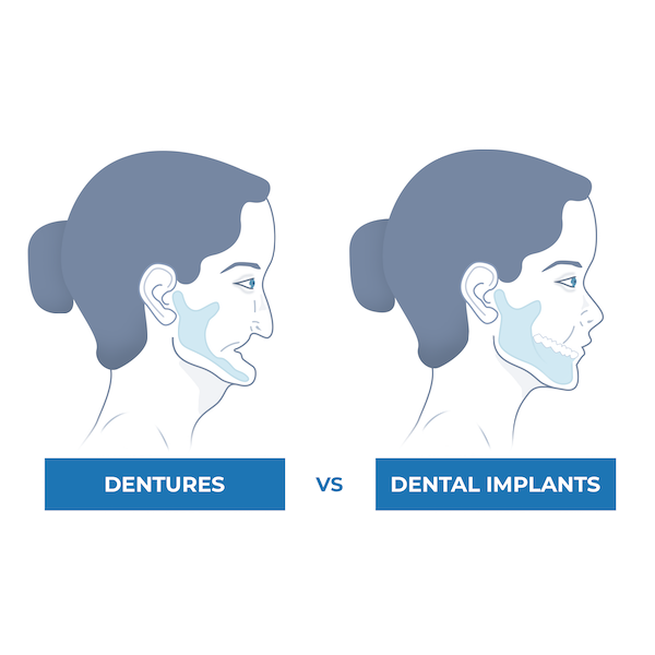 When teeth are missing, the jawbone shrinks over time (and constant pressure from dentures can even accelerate the problem).